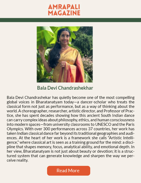 Bala Devi Chandrashekar is a professor of practice in Asian Performing Arts. Her approach is interdisciplinary involving performing, lecturing, teaching and intense research. Bala is known for her distinct scholarly style and takes on subjects based on ancient texts supported by intense research. She collaborates with renowned scholars in their respective fields, carving messages from scriptures relevant to the contemporary world and actively presenting this form worldwide.